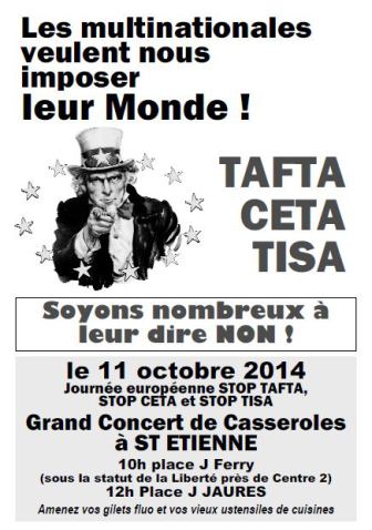 Les Etats-Unis et l'Europe sont en train de signer dans le plus grand silence médiatique un traité qui va nous engager dans l'avenir ainsi que nos enfants....., en ouvrant grand les marchés et en supprimant les droits de douane. Ils viennent d'ailleurs (les Américains) de signer un autre traité : le Transpacifique avec 13 pays asiatiques et autres sauf évidemment la Chine.